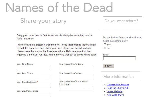 I noted in the morning newspaper that Rep. Alan Grayson has established an online roll of those that have died from lack of medical care.
