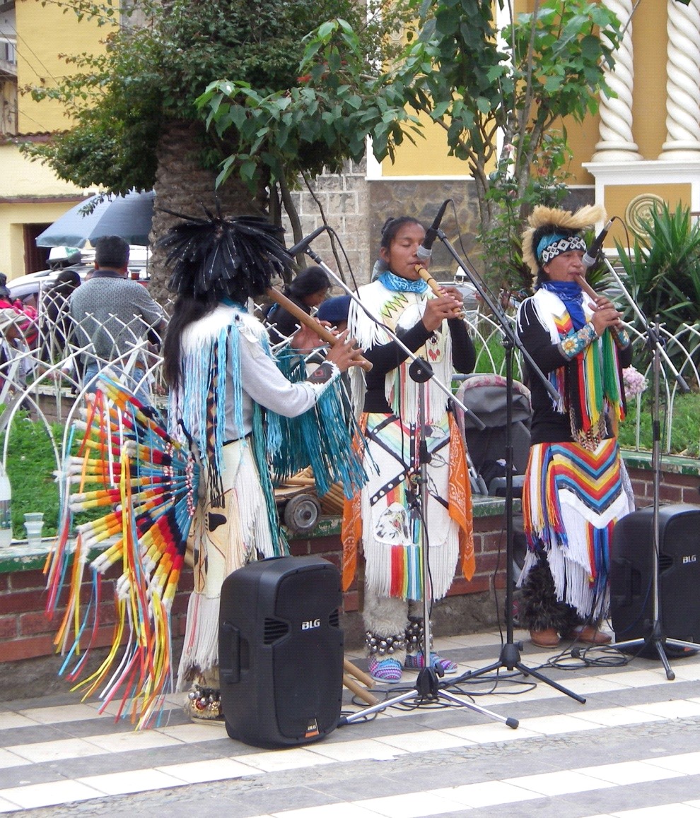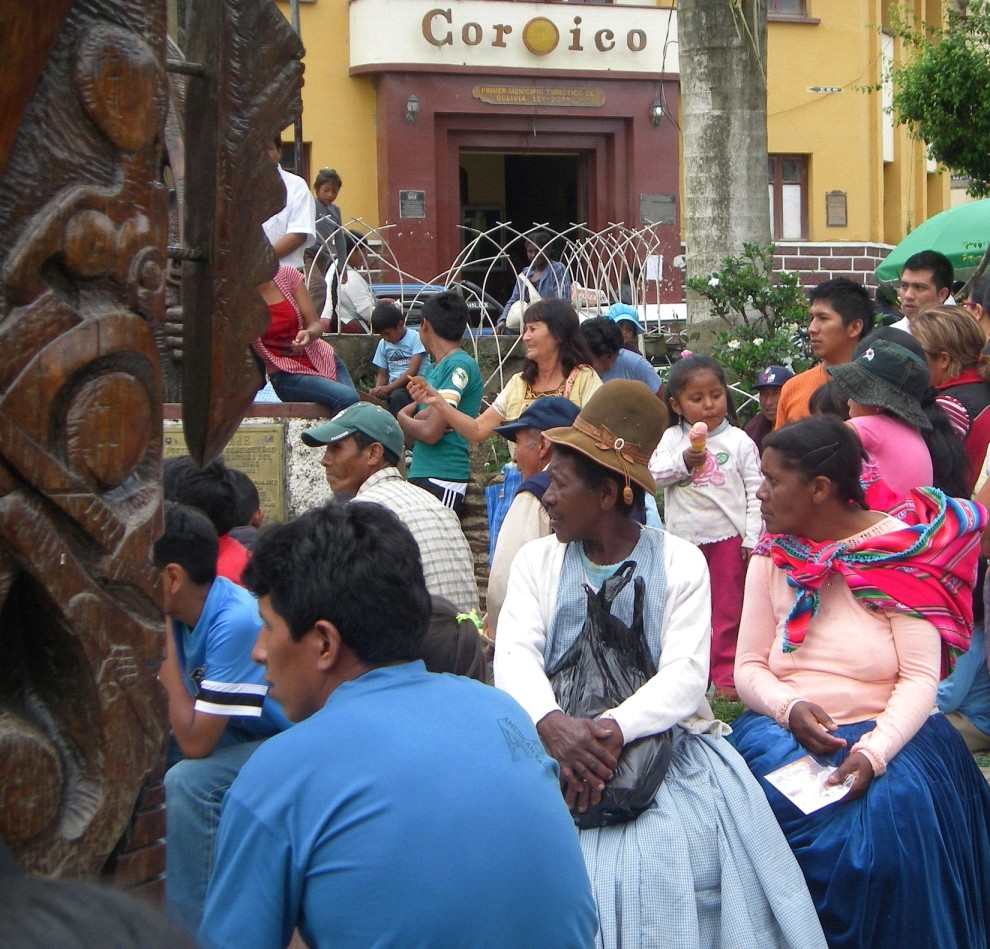 | Andean music on the plaza draws a crowd. Traditional women from the Afro-Bolivian community (seated, right front) are said to be prolific coca users. |