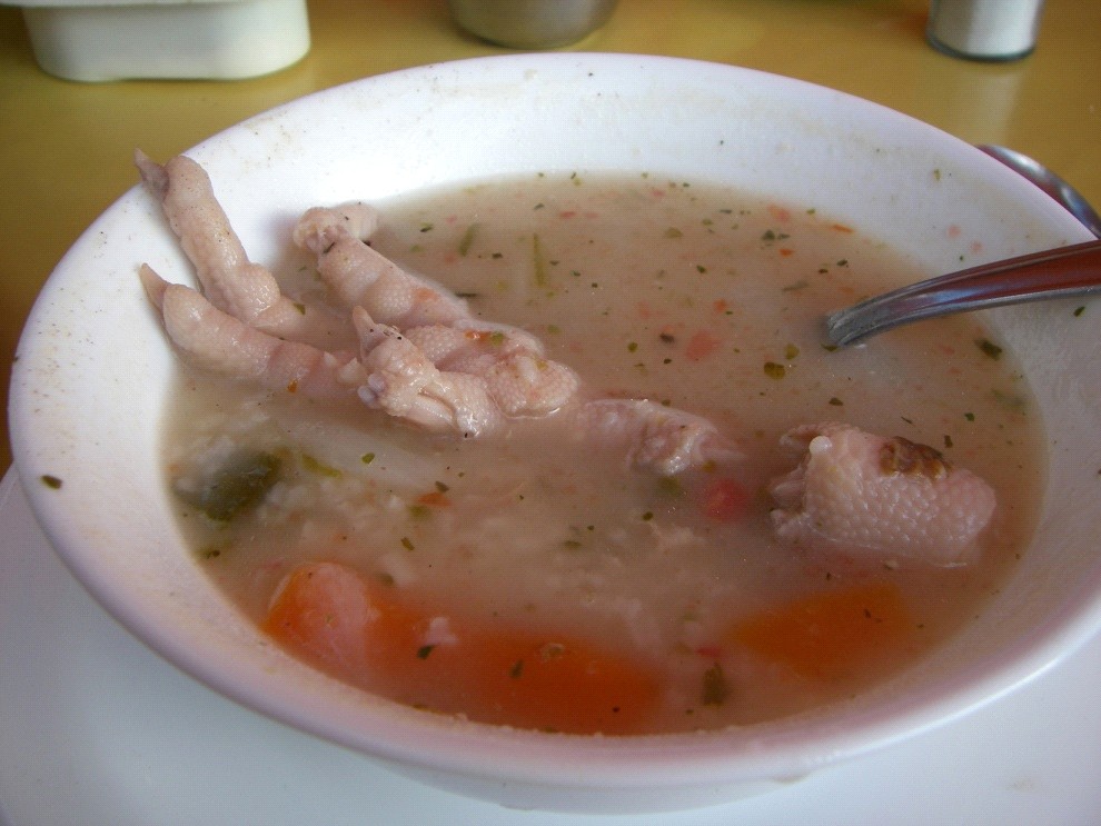 Besides cattle, pigs, poultry, and sheep, two domestic camelid species, llamas and alpacas, are raised for meat, fiber, and as beasts of burden. (Wild vicuñas are protected.) Alpaca meat isn’t much different from grass-fed beef in flavor. Guinea pigs (cuy) are also a traditional Andean food. Richard ate cuy years ago in Ecuador; I’ll pass! However, some dishes I did have were equally odd, like this “chicken foot soup”: