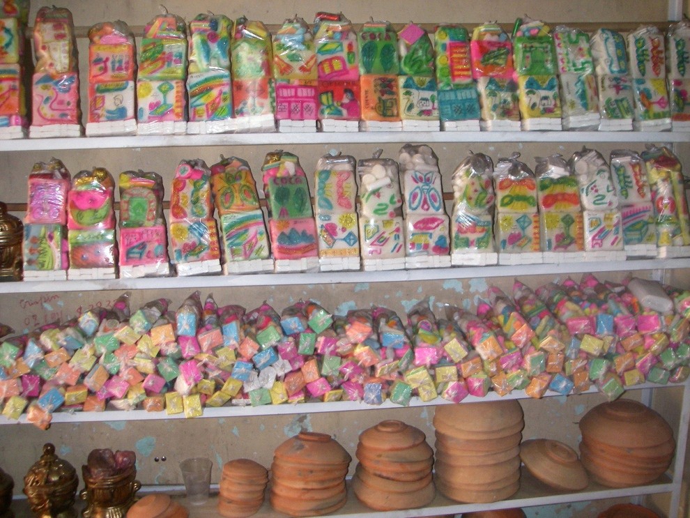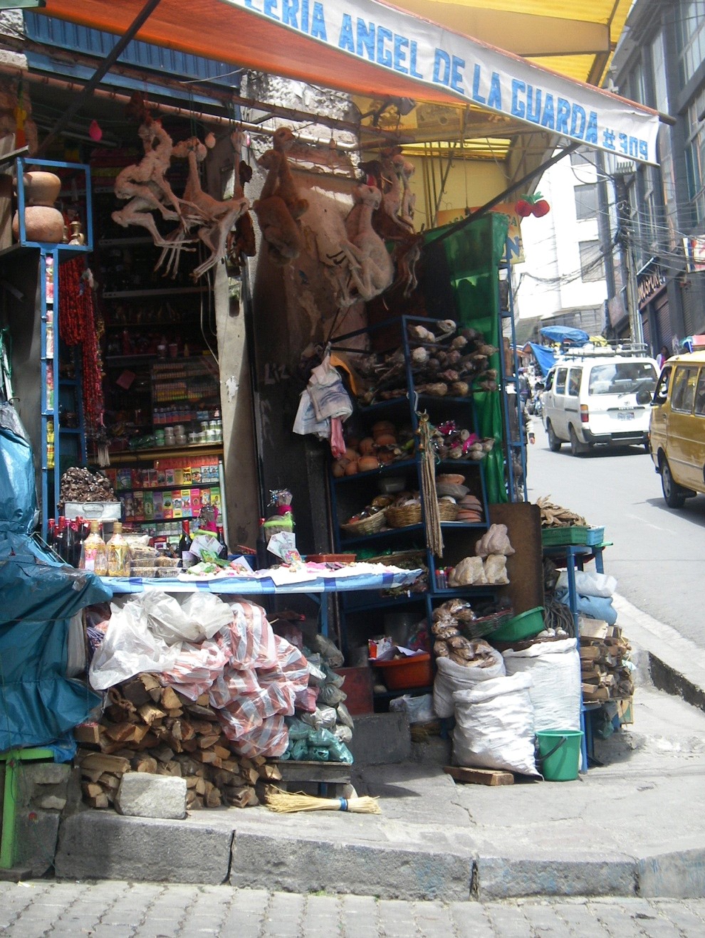 Not all traditional medicine in the region is herbal or food-based. Good luck rituals and tokens abound, like the brightly-colored fetishes below, in La Paz’ Mercado de Hechicería (Witches’ Market). Arriving during Carnavál, we also saw cars, taxis, and buses decorated and prayed over as a blessing; and good luck icons by the score, such as miniatures of items the buyer hopes to obtain: money, cars, televisions, etc.[3] All of the shops in the Hechicería had coca. Some Andean shamans use hojas to divine the future.