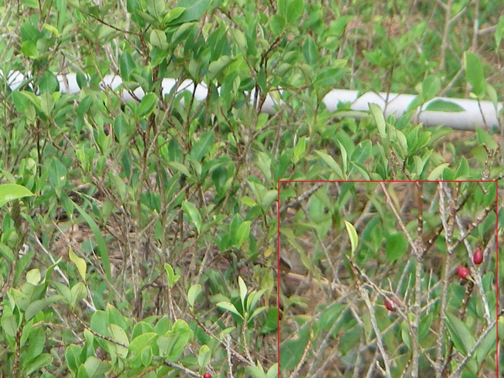 Our “where’s Waldo?” moment: a day after our field trip, strolling across Coroico’s plaza for perhaps the 50th time that week, we finally recognized the healthy if somewhat untended stand of cocal growing there among the palms and hibiscus (Hibiscus sabdariffa). Since this is about the only flat spot in Nor Yungas, it seemed to settle whether cocal must be grown on a slope! (The question of altitude remains open.)