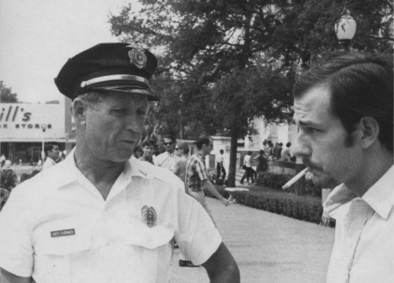 Thorne Dreyer (right) and University of Texas campus cop, October 1966. Photograph Source: Thorne Webb Dreyer – CC BY-SA 3.0