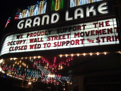 Another wonderful thing: yes, there are some printed signs, made by unions or community organizations; there is a beautiful silk-screened poster that proclaims “Hella Occupy Oakland.” But there are thousands of little hand-made signs, on poster board or flattened cardboard boxes — little individual expressions, each person’s best thoughts on the moment. Strung together, they are like poems – beautiful words bobbing and swirling past.