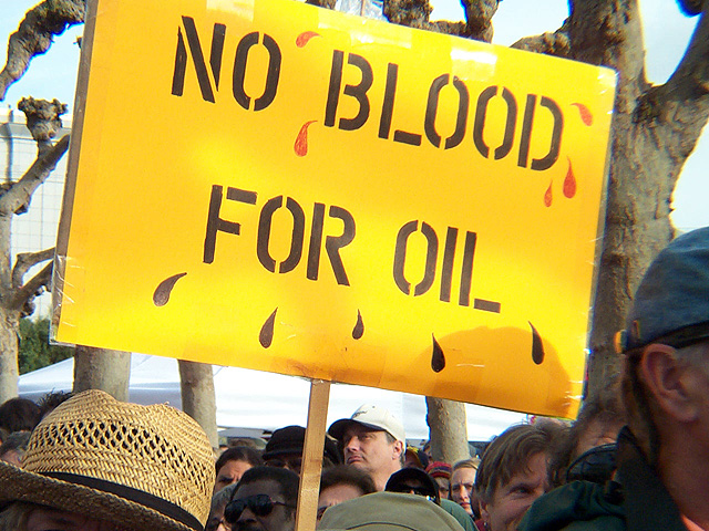 Still, chants are part of political rallies, and I’m part of political movements that rally. So, I try to use the slogans as a starting point to explore issues in more depth. One of the most important of those chants from anti-war rallies of the past couple of decades is “No blood for oil.” On the 10th anniversary of the U.S. invasion of Iraq, that slogan remains as important as ever.