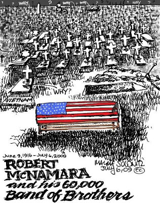Political cartoons are often not intended to be funny, but thought-provoking. Of course you’re right that McNamara wasn’t alone in his responsibility for the Vietnam debacle, but he has just died and is therefore in the news, and he is forever associated with that tragically gallant phrase, and with the deaths of 60,000 US service personnel.