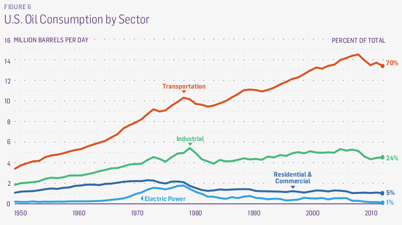 By 2006, our imported oil habit was still growing and caused about 35% of our trade deficit. (See Figure 1 in this link.) Since then, we have been able to produce more oil and cut back on our oil imports (see Figure 3), but now it has risen so much in price that it constitutes about 60% of the total U.S. trade deficit. Transportation, mostly driving, still accounts for about 70% of U.S. Oil consumption, despite the fact that driving has declined slightly after peaking in 2007.
