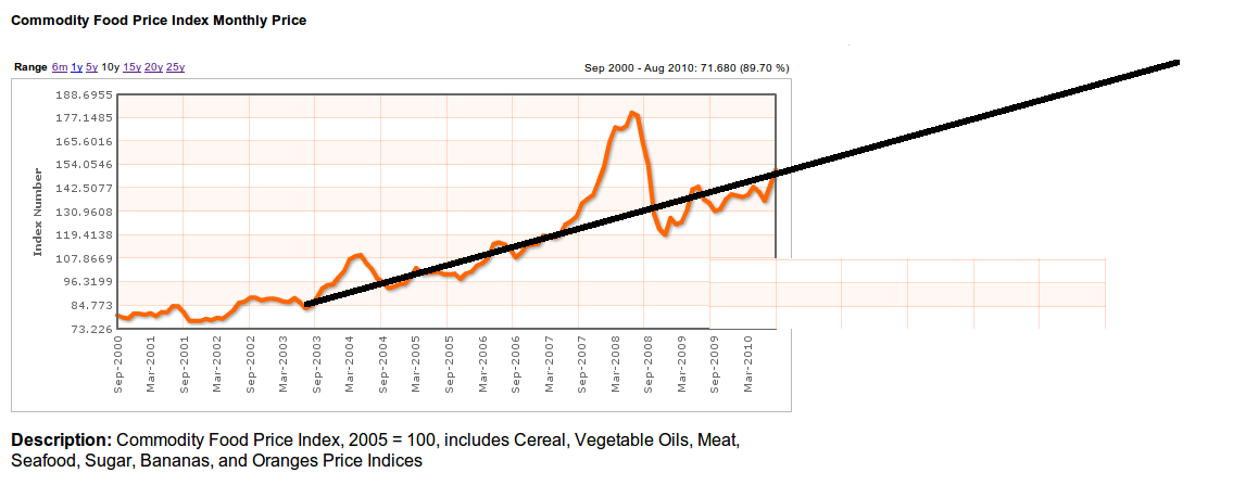 When we try to discount the early 2008 food price spike tied to oil oil costs, and to speculation, we see the longer term food price index rise of more than 10 percent a year. This trend line looks like it will intersect its previous price 2008 peak before 2014, if not before.