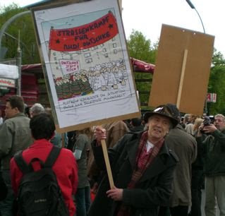 But this year, 2008, 40 years after “68”, a huge kaleidoscope of photo exhibits, film series, discussions and events in Berlin have revisited “68” – at places like the Academy of Art, and, my favorite, actually inside the building of the America Haus, with an old water cannon parked in front, showing the protests back then outside the America Haus. Keep your eyes on The Rag Blog for more on this in the future.