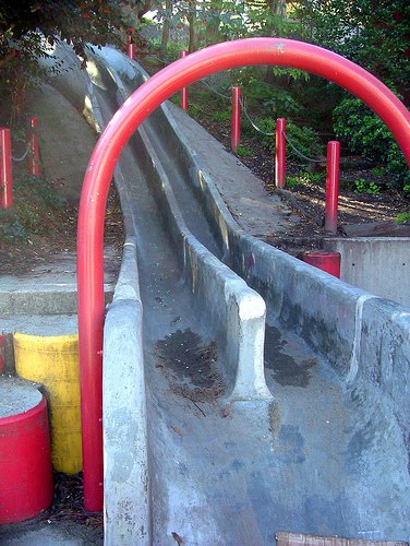 For the lower portion of the plot, a contest was held to design a “mini-park” in 1973. The winning design, by 14-year-old Kim Clark, featured a pair of curved concrete slides. These slides never fail to bring out the inner child in everyone. I’ve had walkers of all ages toboggan down on flattened cardboard boxes. If the slides are dry enough, and you recline as if in a luge, you can even catch some air on the way down. It’s exhilarating.