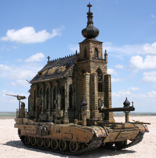 It’s all about how I see the evolution of what man makes his created environment look like. I had such a major emphasis in painting and drawing earlier in my career, and had a great time with it but I always felt something was missing. I knew deep inside I was a builder, and so my 3-d work is the expansion into that realm. I still enjoy painting and doing figurative work, but those moments are reserved for special times. Yet sculptural works are wonderfully intricate constructions of pop culture effluvia like plastic model kits, injection molded toys, dolls, plastic skulls, knick-knack figurines, miniature fencing, toy animals, mechanical parts and ornate frames or furniture parts; assembled into grotesque tableaux that look a bit like an explosion in Hieronymus Bosch’s attic.