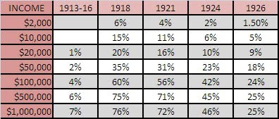 By 1920, with the debt generally paid, the consensus of government was that tax rates could and should be cut, especially from the upper brackets. The results were the income tax cuts in 1921, as well as following cuts again in 1924 and 1926 due to a continued growth in government surpluses. Rates changed during this period according to the following table: