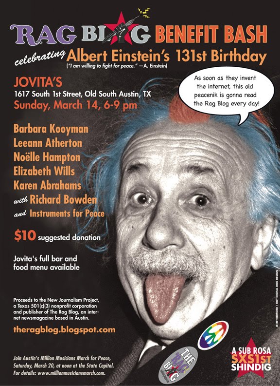 The Rag Blog, the Austin-based progressive internet newsmagazine, is celebrating Albert Einstein’s 131st birthday with a big benefit bash at Jovita’s, 1617 South 1st Street in Austin, from 6-9 p.m., this Sunday, March 14.
