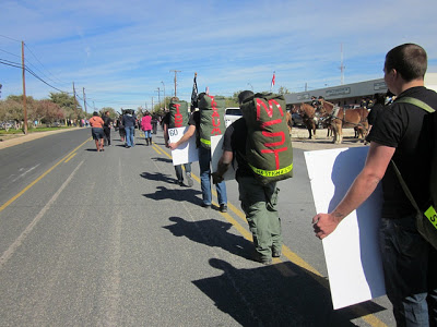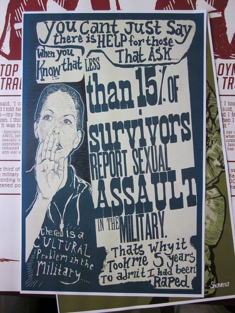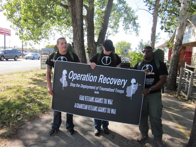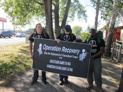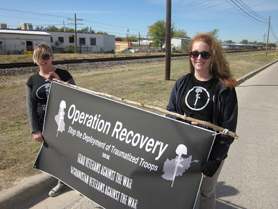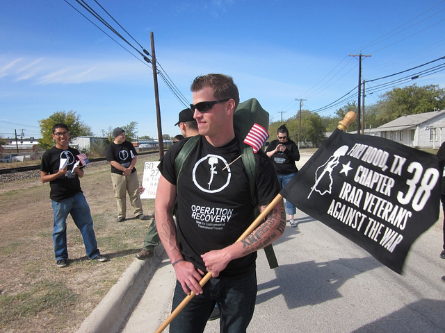 The symbolism of the burdens of war borne by soldiers provided a strong visual message. The soldiers also carried signs calling on Ft. Hood’s base commander, General Donald Campbell, to stop deploying traumatized troops from Ft. Hood.