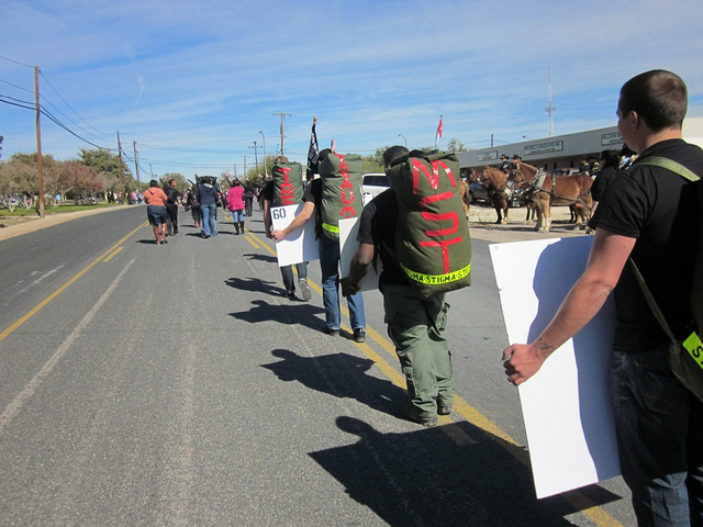 To dramatize the message in the parade, four soldiers marched single file, carrying full army duffel bags on their backs. The bags were labeled “Trauma,” “PTSD,” “MST” (Military Sexual Trauma, and “TBI” (Traumatic Brain Injury). Each bag was also ringed with the word, “Stigma” in bold lettering.