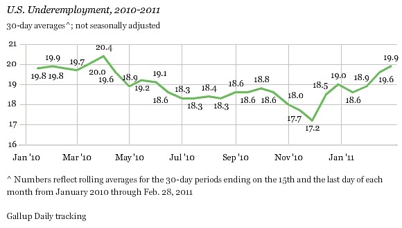 And when you add in the number of people who are working part-time because they can’t find full-time work (about 9.6%), which Gallup calls the underemployment rate, the numbers get pretty scary. That figure now rests at 19.9%. Last year at this time it was 19.7%.