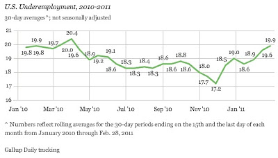 Gallup shows unemployment has been steadily climbing since the end of December. They showed a 9.6% unemployment rate at the end of December and a 9.8% rate at the end of January. The end of February marked a return to double-digit unemployment with a rate of 10.3%. That is virtually the same rate as this time last year (10.4%), which means that the economy is just spinning its wheels and going nowhere regarding job creation.