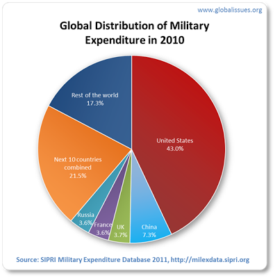 If the budget deficit needs to be brought under control, as the politicians tell us it does, then the cuts should come from the vastly out of control military budget. We could cut our military budget in half and still be spending far more than any other country in the world (and more than China, Russia, France, and the United Kingdom combined). That would be more than enough to insure our national defense — and it would free up billions to help hurting Americans.