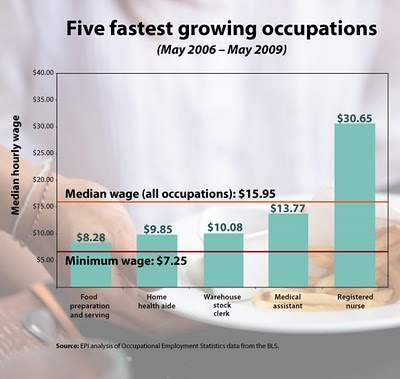 The chart above is indicative of the problem. The chart shows the five fastest growing jobs in the United States. Only one of those jobs (registered nurse) is above the median wage in America. The other four (food preparation and serving, home health aide, warehouse stock clerk, medical assistant) are well below the median wage and approaching the minimum wage. The problem is even worse when you consider the median wage has been depressed for the last 20 or more years and won’t buy close what it once would.