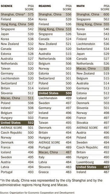 None of those scores is anything to brag about, especially when compared to the Chinese scores which were much higher (reading 556, science 575, math 600). Several other Asian countries (Japan, Singapore, South Korea, Taiwan) also scored significantly higher than students in the United States. The fact is that while these countries are pushing education and demanding a lot from their students, the United States is falling behind.