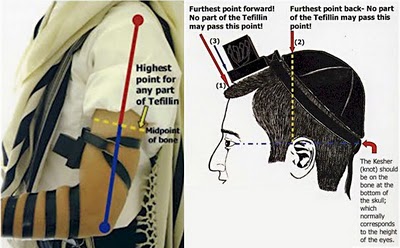 Here are illustrations from an Orthodox Jewish web site showing precisely “how to lay tefillin” or how to properly put these prayer-assist items onto the head and arm. They are also called “phylactery,” or small leather boxes containing Hebrew texts: