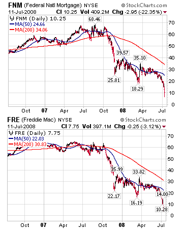 On the broadest level, Treasury Secretary Paulson has said that these companies are being taken over in order to reflate the real estate market. Fannie and Freddie were almost single-handedly supporting the junk mortgage market that was making Wall Street rich.