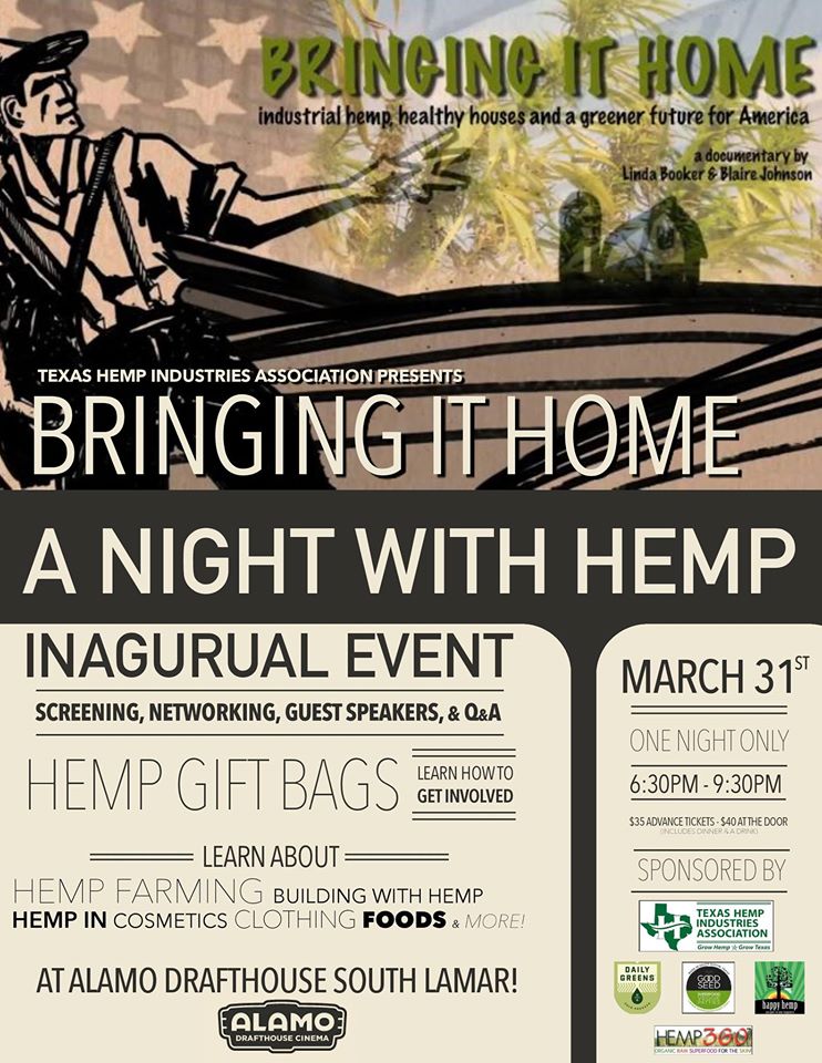 The Texas Hemp Industries Association is presenting “Bringing It Home: A Night with Hemp” at the Alamo Drafthouse South Lamar, 1000 South Lamar Blvd., Austin, on March 31, 6:30-9:30 p.m.