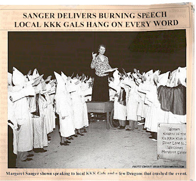 In 1926, she was invited to speak to the ladies axillary of the Ku Klux Klan in Silver Lake, New Jersey. After being driven in a curtain shuttered car for almost an hour, way out into a country field, she gave a lecture to the robed and hooded ladies, as well as a smattering of male Klansmen. In her memoirs she described it as “one of the weirdest experiences I had in lecturing,” noting that she was forced to use only “the most elementary terms, as though I were trying to make children understand.” The KKK ladies and their male attendees were reportedly delighted with the idea of promoting birth control for ‘the colored folks.’