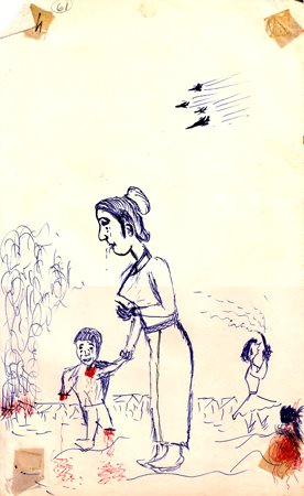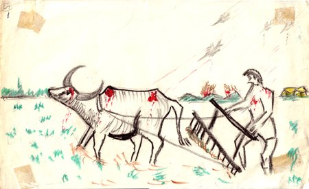 Between December 1970 and May 1971, Fred Branfman, an American, and Boungeun, a Lao man, collected illustrations and narratives in the Vientiane refugee camps, where bombing victims fled. The drawings and narratives represent the voiceless, faceless, and nameless who endured an air war campaign committed in secrecy. Drawn in pencil, pens, crayons, and markers, they are raw and stark, reflecting the crude events that shaped their reality. The simplicity of the narration and drawings emphasize the illustrators’ identities as ordinary villagers who bore witness to a devastating event.