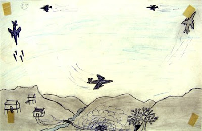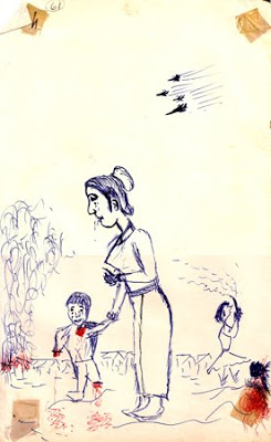 Each of the illustrations demonstrates the violence of warfare. However, the images of blood and death are contradicted by the memories of the scenic and peaceful village life these survivors once lived. Scenes show farmers tending to their rice fields, monks praying at the temple, women going to the market, and children playing in the schoolyard. The drawings capture the very moments when their lives and society were forever altered. The illustrations and narratives are at the heart of the Legacies of War National Traveling Exhibition, which is accompanied by historical photos, maps and other relevant documents to give context to the decade-long bombings.