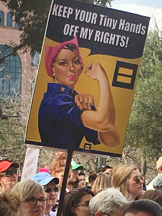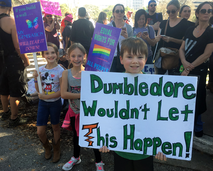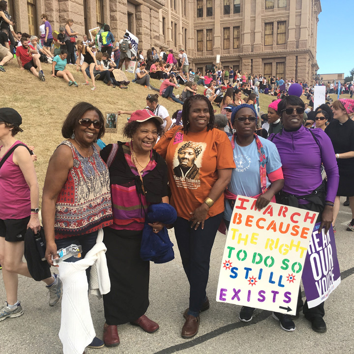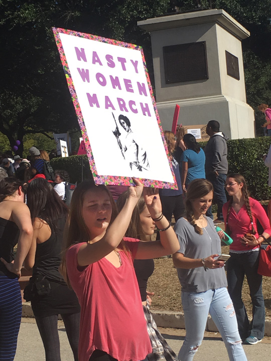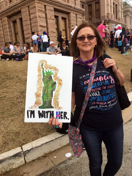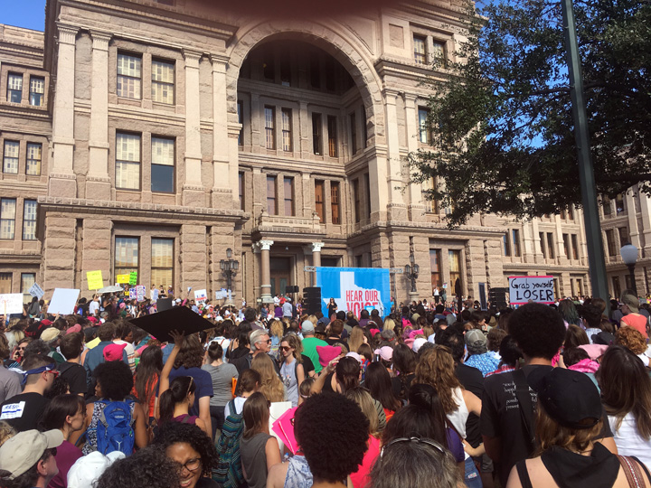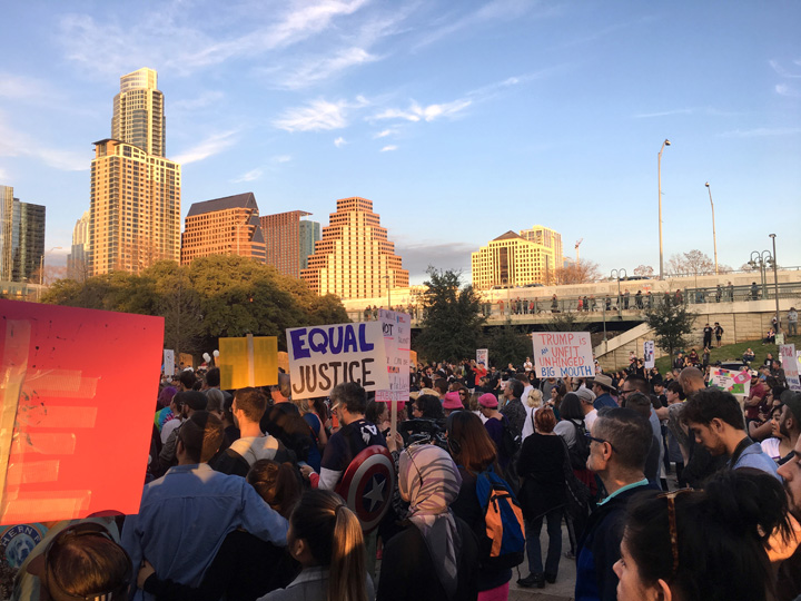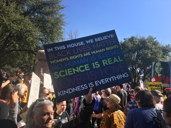 Especially notable in Austin was the range of signs — supporting immigrants’ rights, public education, Muslims, Black Lives Matter, LGBT Rights, climate science, human rights, women’s right to choose — and the fact that the crowd was made up of women, men, and families of all ages, colors, and ethnicities.
