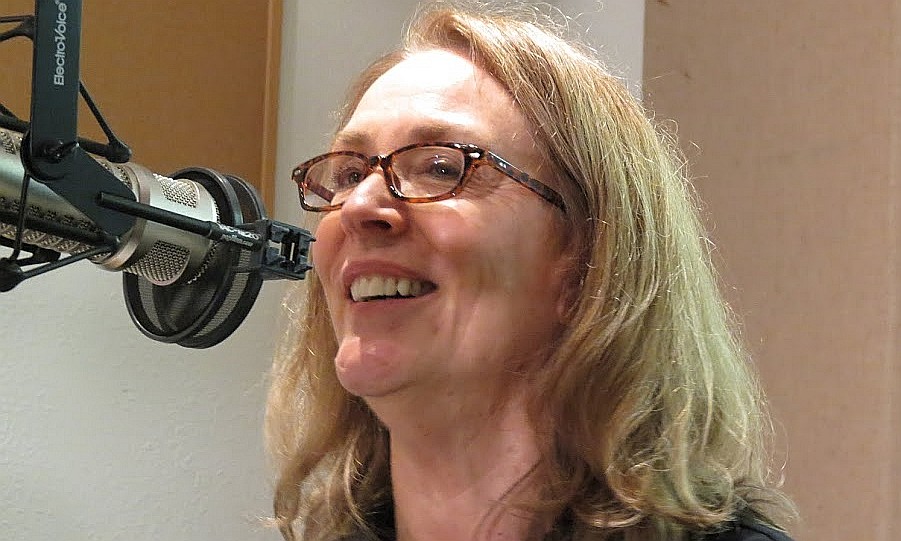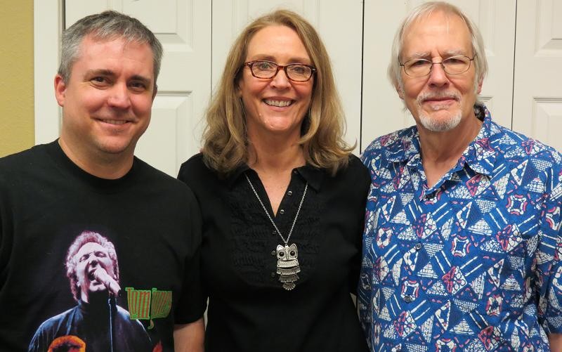 Novelist Sarah Bird, flanked by Rag Radio’s Tracey Schulz, left, and host Thorne Dreyer, in the KOOP studios in Austin, May 16, 2014. Photo by Roger Baker / The Rag Blog.