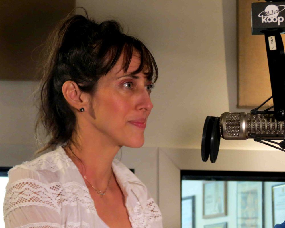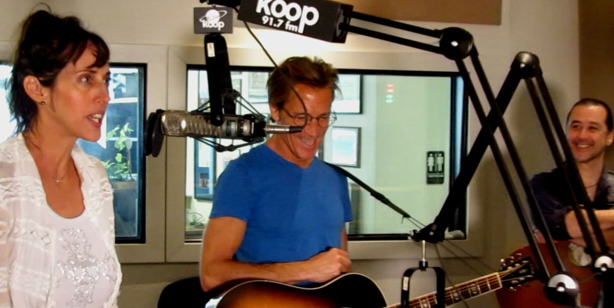 Rocker and actress Patricia Vonne, from left, with musicians Robert La Roche and Rick Del Castillo, on Rag Radio, Friday, June 12, 2015. Photo by