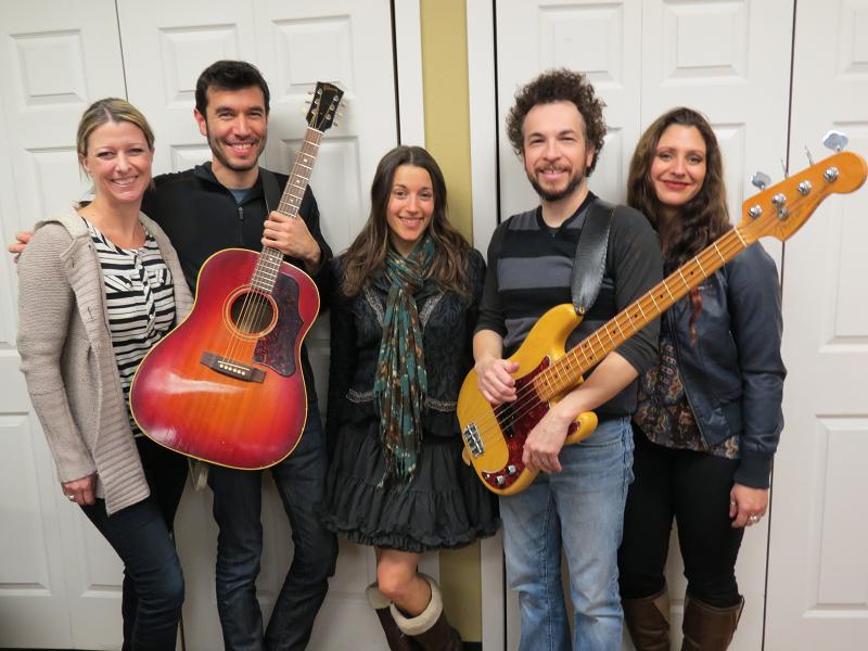 Charlie Faye and Friends in the studios of KOOP in Austin, February 7, 2014. From left: Noëlle Hampton, Jake Owen, Charlie Faye, Lonnie Trevino, and Wendy Colonna. Photo by Roger Baker / The Rag Blog.