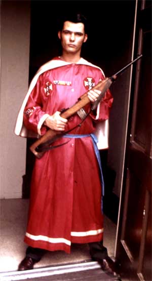 A Houston policeman, a member of the Ku Klux Klan in Texas, poses in 1972 with hood and mask, with his badge number covered with masking tape and hand. Photo by Ron Laytner / Edit International.