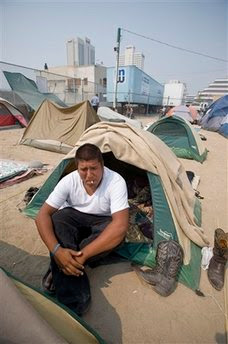 “I figured this would be a great place for a job,” said Max Perez, a 19-year-old from Iowa. He couldn’t find one and ended up taking showers at the men’s shelter and sleeping in a pup tent barely big enough to cover his body.