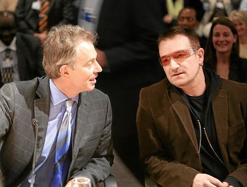 British PM Tony Blair hobs with Bono during the World Economic Forum in Davos, Switzerland, January 26, 2007.
