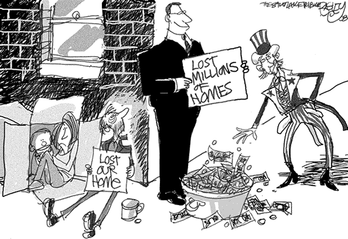 What is hard to understand for the layman is how the same batch of mortgages can become the collateral for a number of derivative instruments that are essentially laid on top of one another. One form of derivative is the credit default swap, which was invented as a sort of insurance on risky loans. What they became were wagers on what bundled securities would turn out to be profitable. Then people placed bets on the bets, and on and on. In September 2008 there was $54 trillion in the credit swaps market. To put this in perspective, we should look at the 2008 Gross Domestic Product, $14,441,425,000. The $54 trillion gambled on one kind of derivative far exceeds the $14.4 trillion GDP.