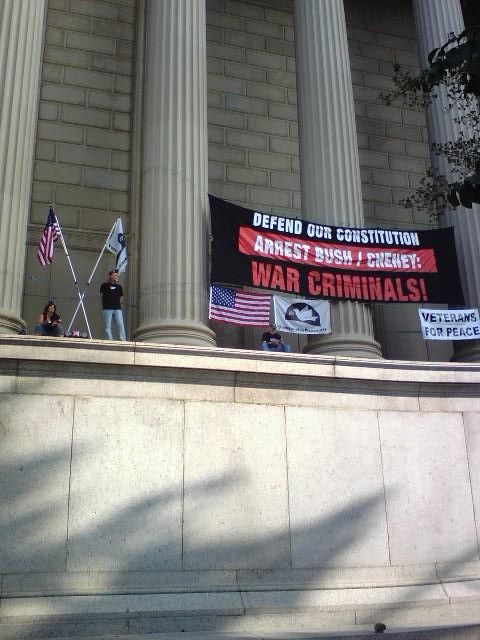 On Tuesday morning, September 23, 7:30am, at the front of the National Archives Building on Constitution Ave. in Washington, D.C., five military veterans will risk arrest as they climb a 9-foot retaining fence and occupy a 35-foot high ledge to raise a 22×8 foot banner stating, “DEFEND OUR CONSTITUTION. ARREST BUSH AND CHENEY: WAR CRIMINALS!”
