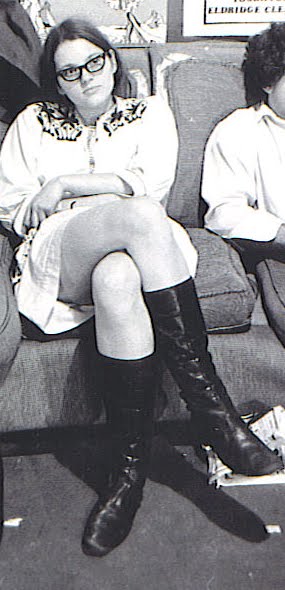Marilyn Buck in her trademark boots, at offices of the San Francisco Express-Times, 1968. Photo by Jeff Blankfort.