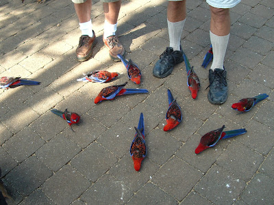 I think these are lorikeets, but they’re not rainbow lorikeets which have blue and green head feathers. Well, they look as though they might be a little pesky … Taken by my Sis’ in Australia.